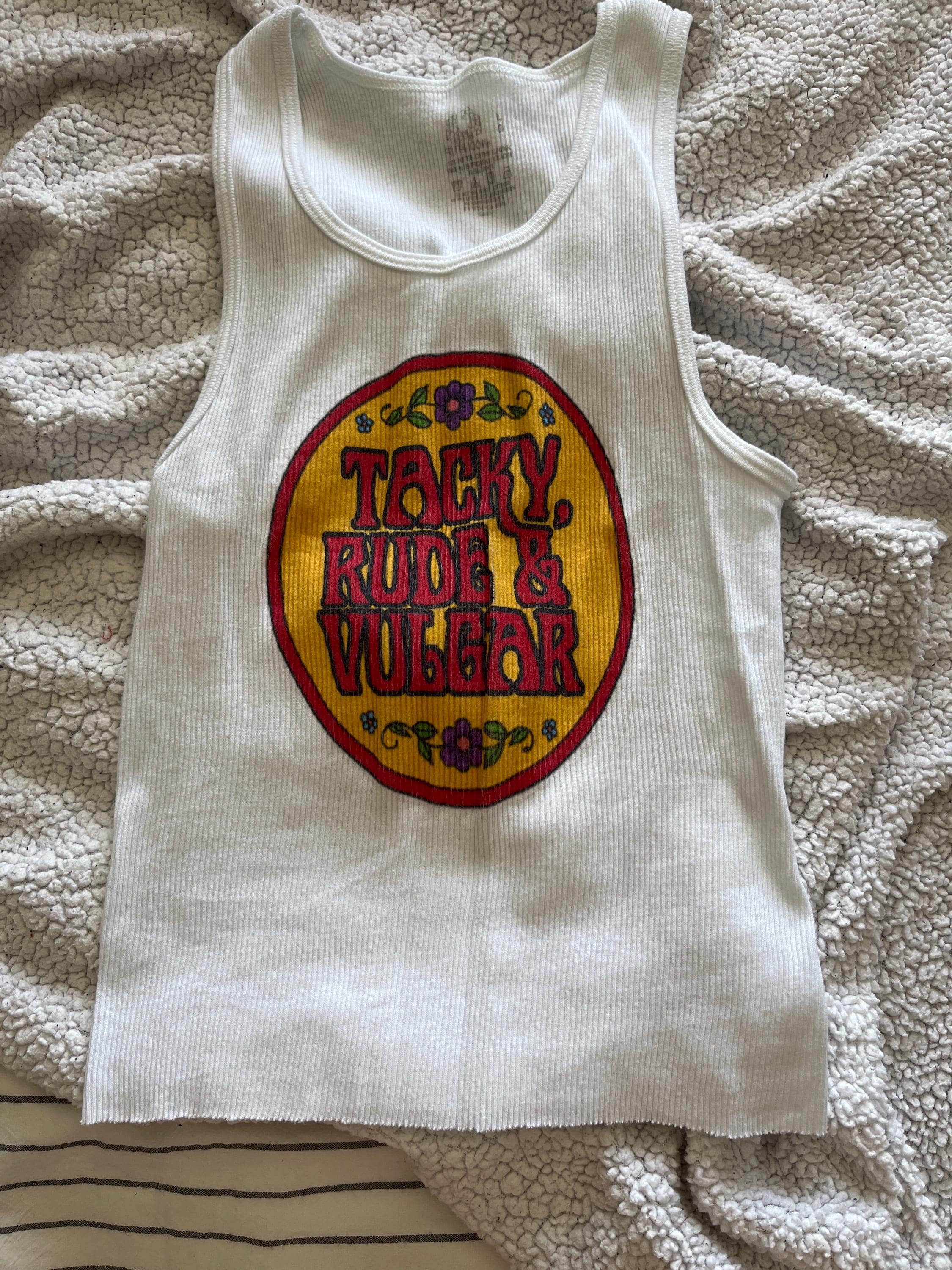 Ribbed tank with a TACKY, RUDE & VULGAR handpressed graphic inspired by 70’s & 80’s bikers.