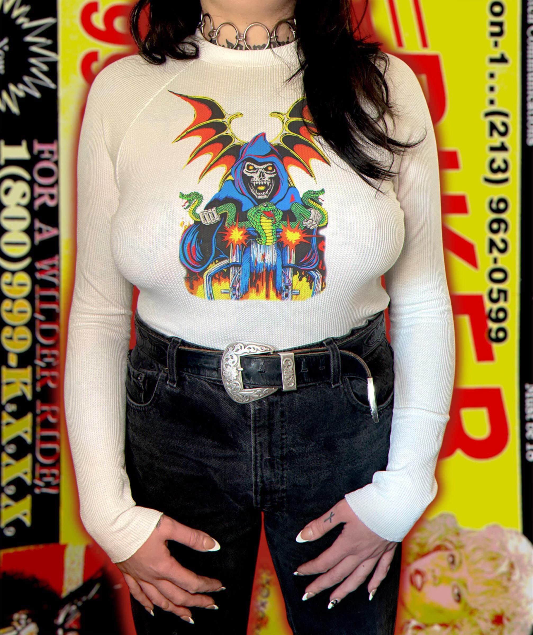 Bitchin’ new waffle knit thermals sewn and printed in-house by Hot Honey Vtg, all thermals are made to order and will ship in 1-2 weeks.