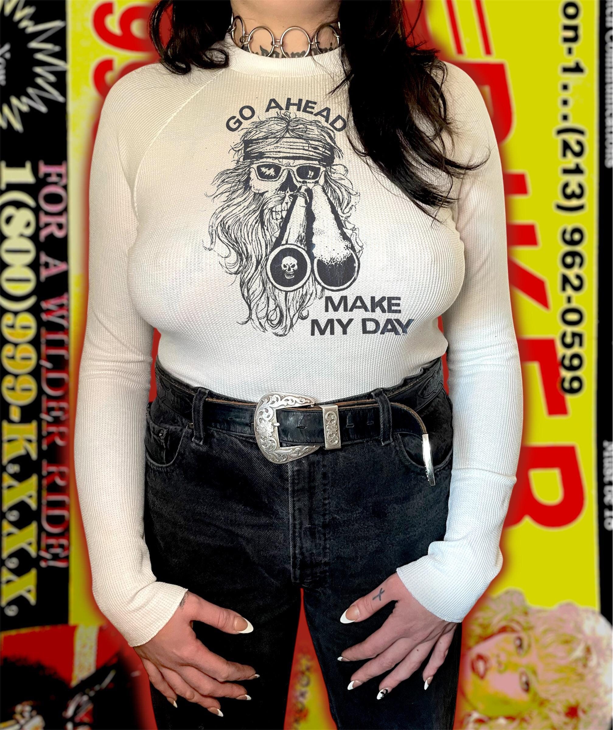 Bitchin’ new waffle knit thermals sewn and printed in-house by Hot Honey Vtg, all thermals are made to order and will ship in 1-2 weeks.