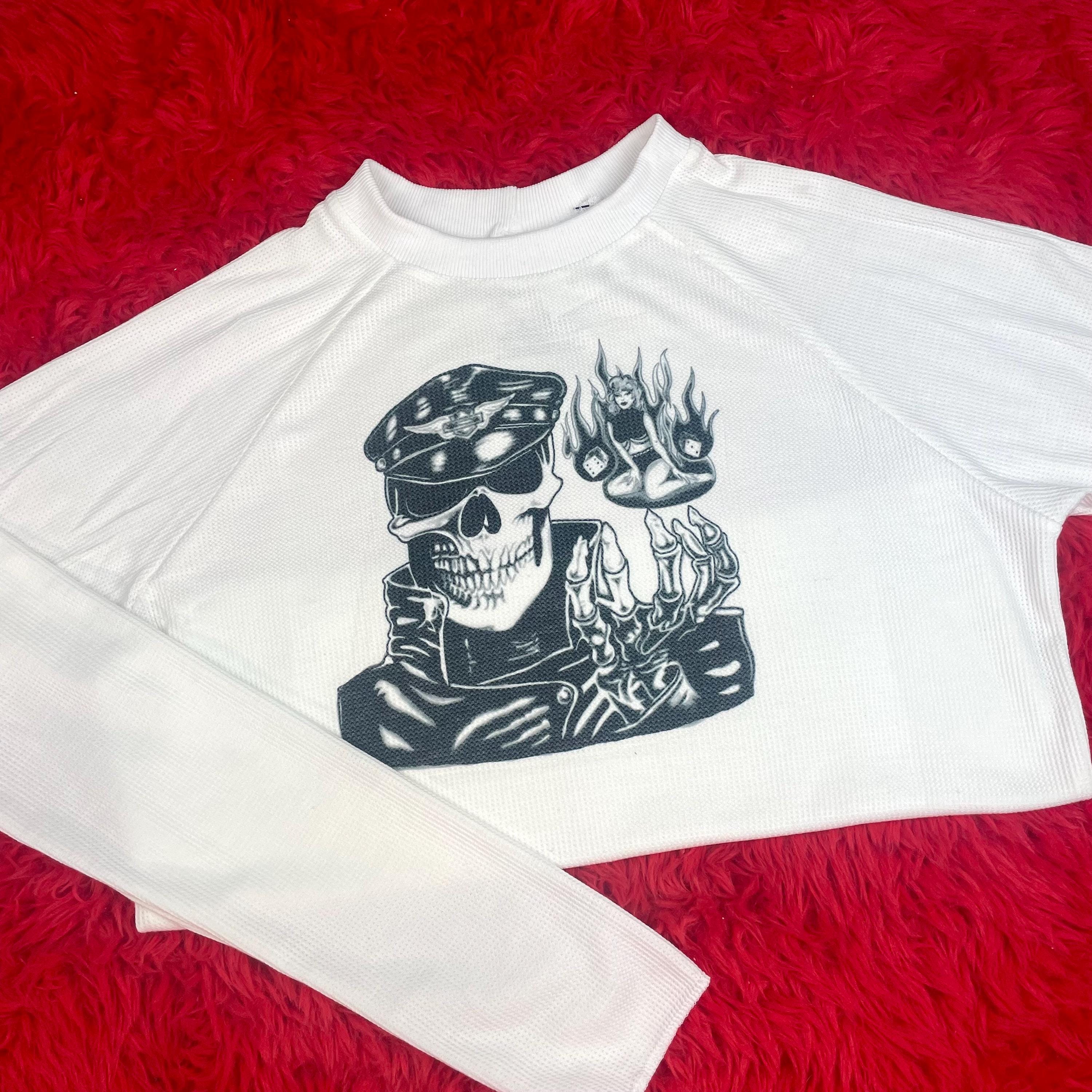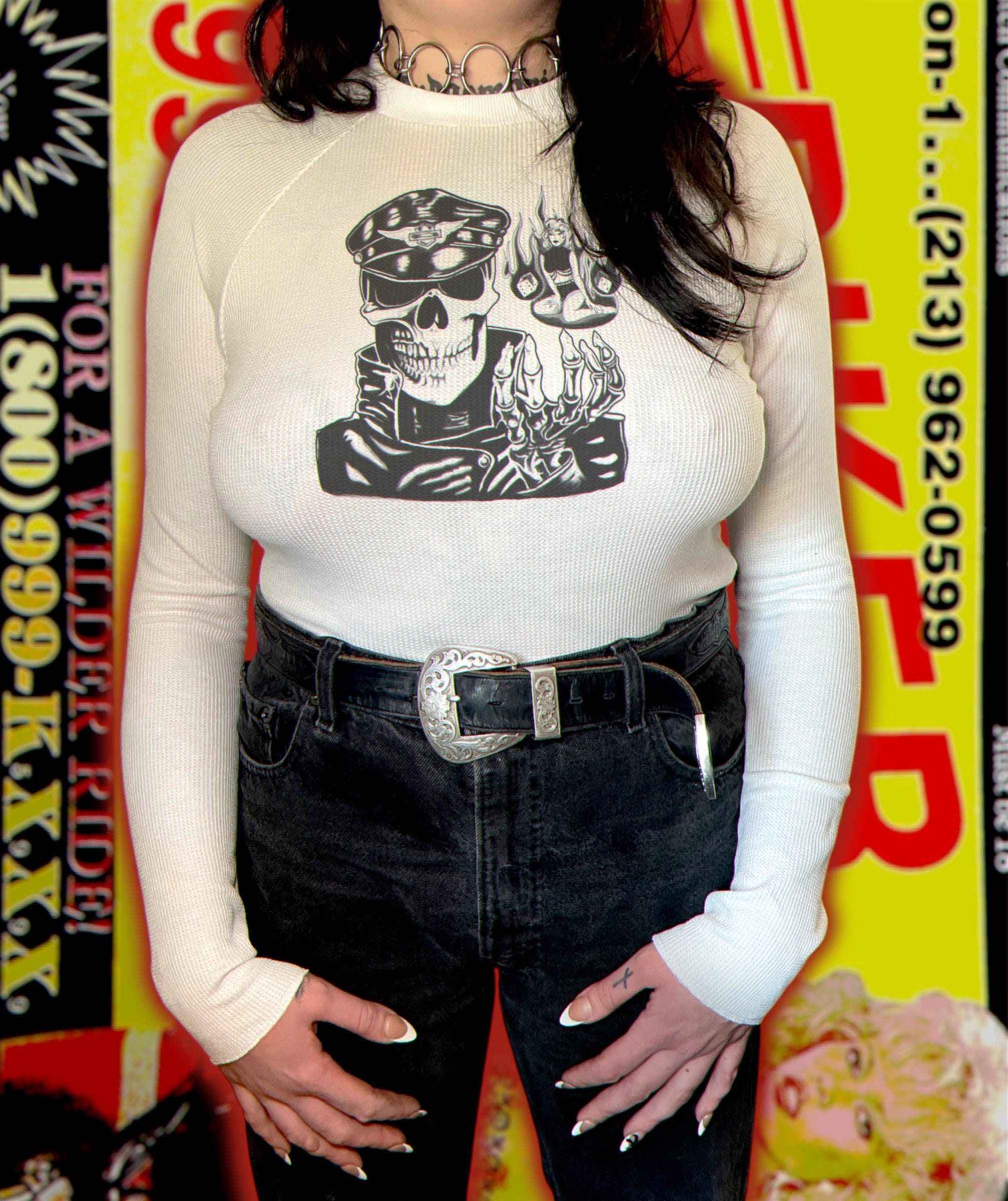 Bitchin’ new waffle knit thermals sewn and printed in-house by Hot Honey Vtg, all thermals are made to order and will ship in 1-2 weeks.