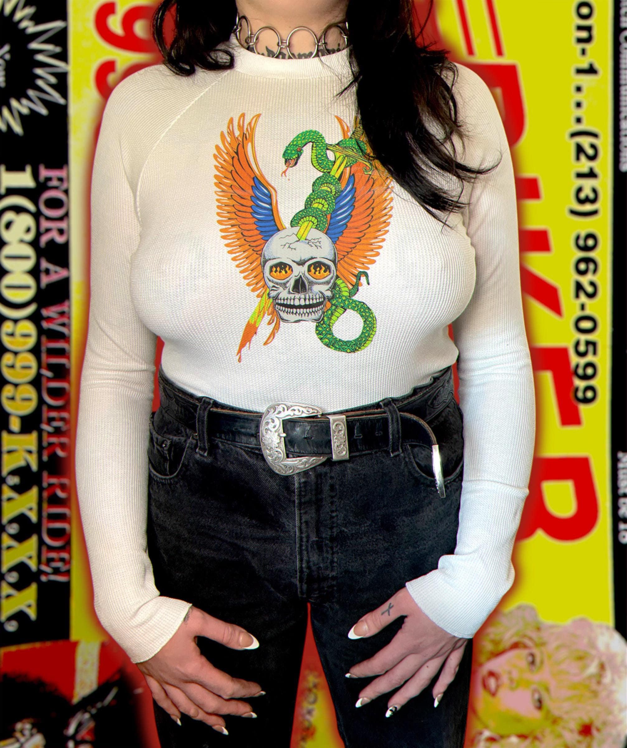 Bitchin’ new waffle knit thermals sewn and printed in-house by Hot Honey Vtg, all thermals are made to order and will ship in 1-2 weeks.