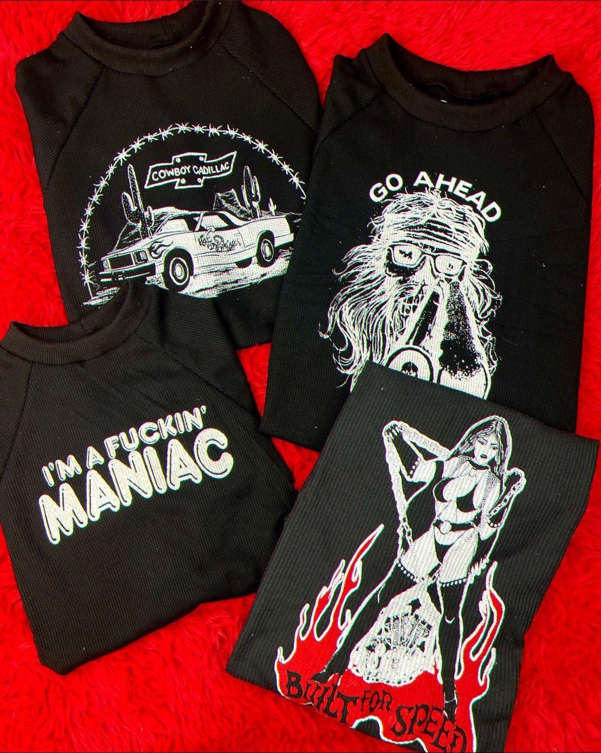 Bitchin’ new waffle knit thermals sewn and printed in-house by Hot Honey Vtg, all thermals are made to order and will ship in 1-2 weeks.