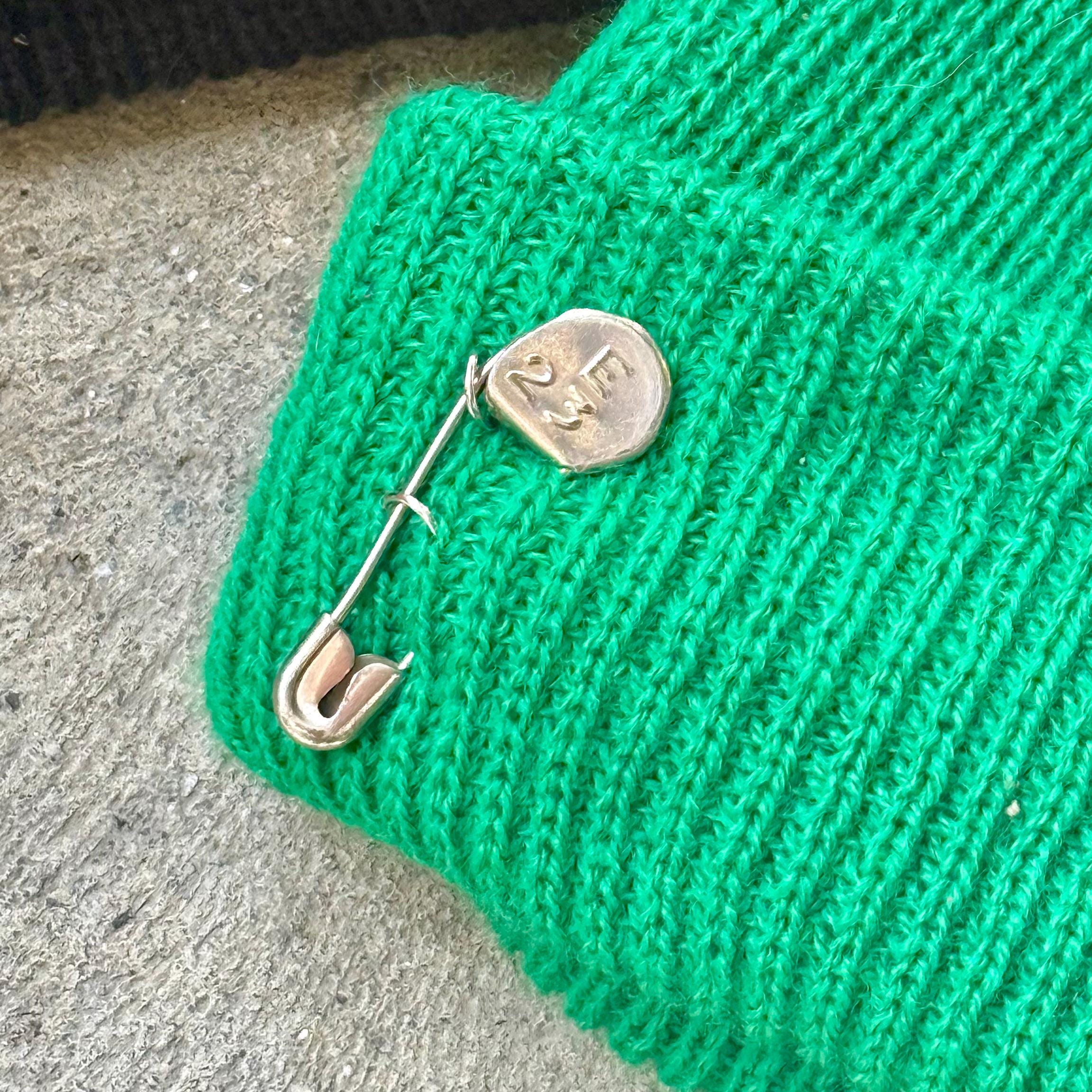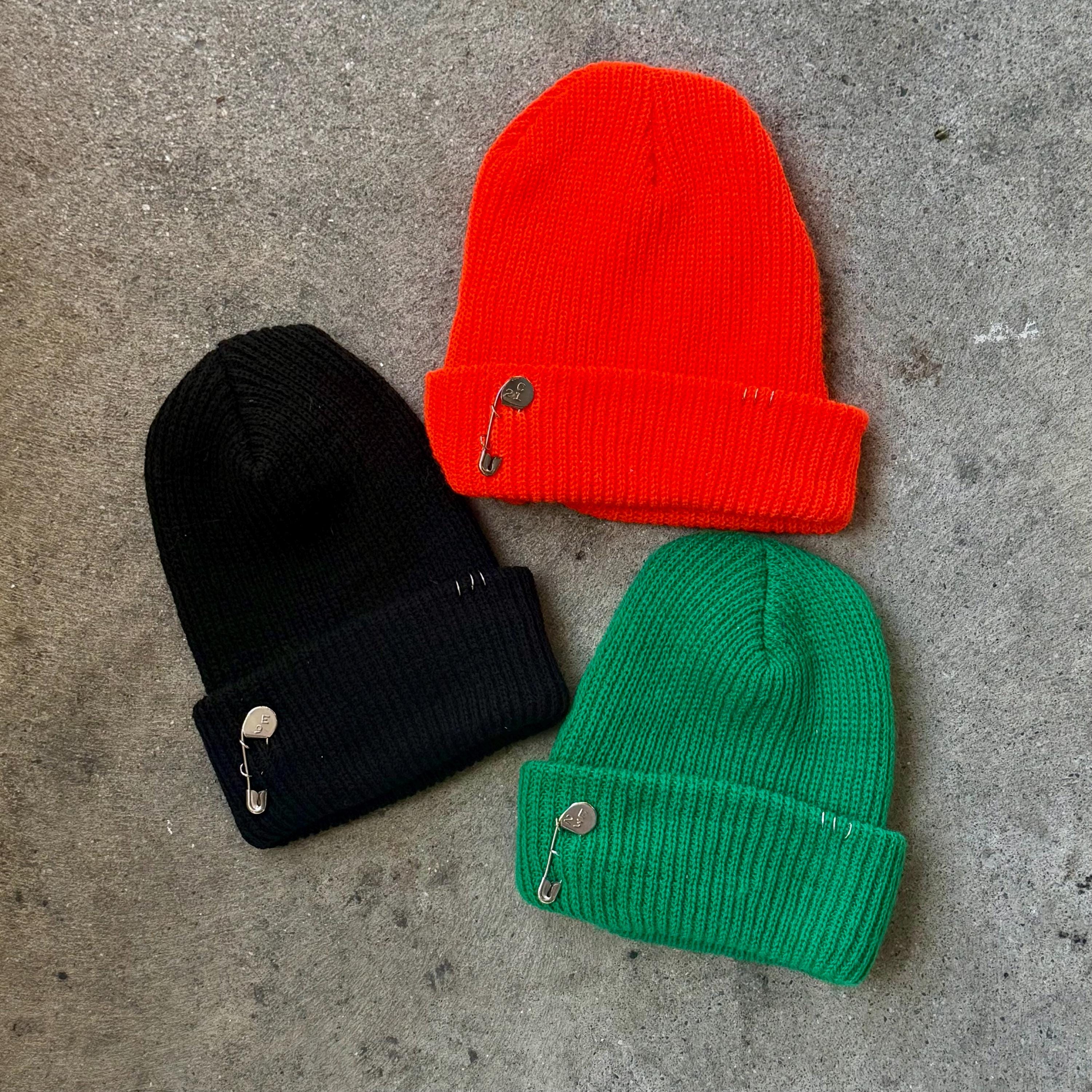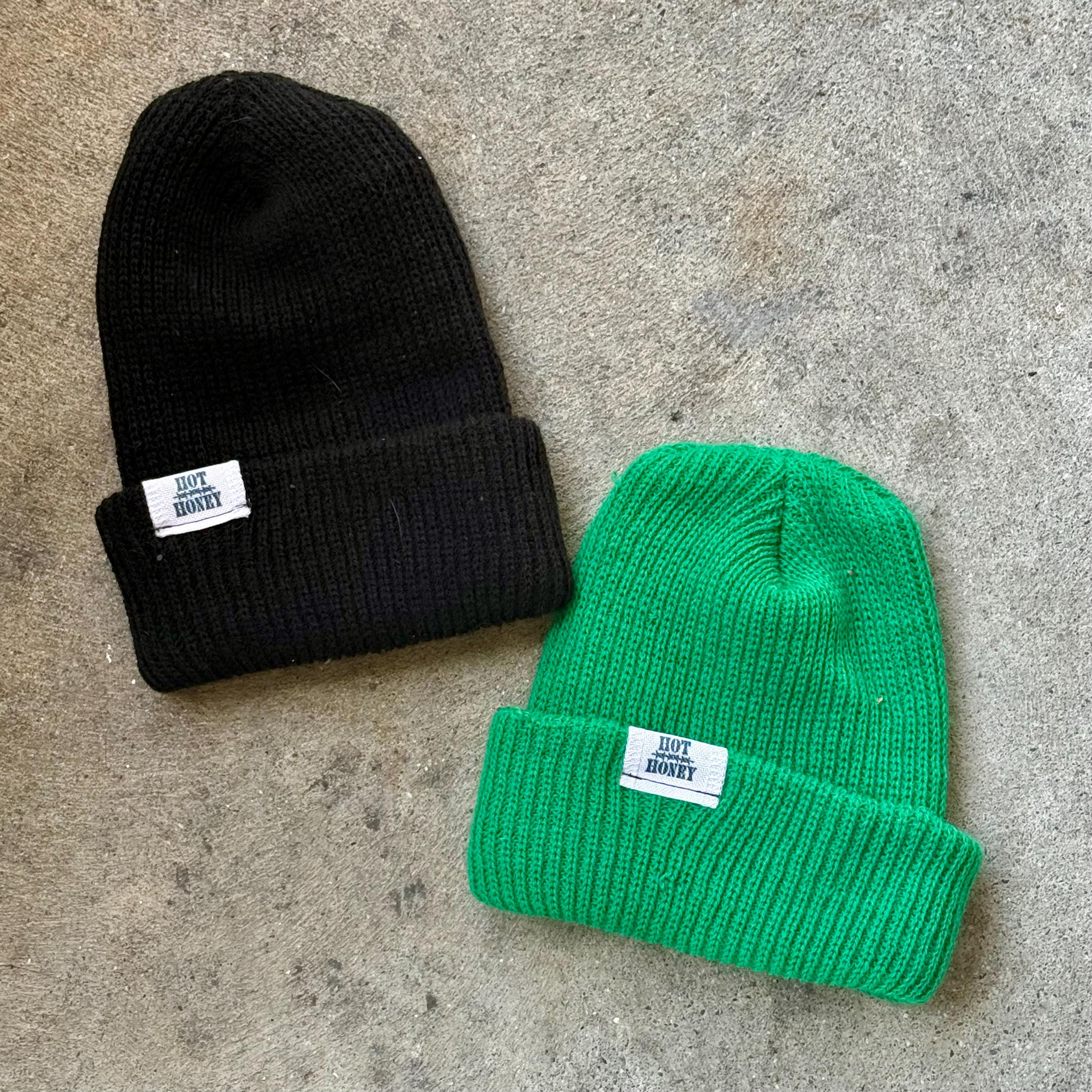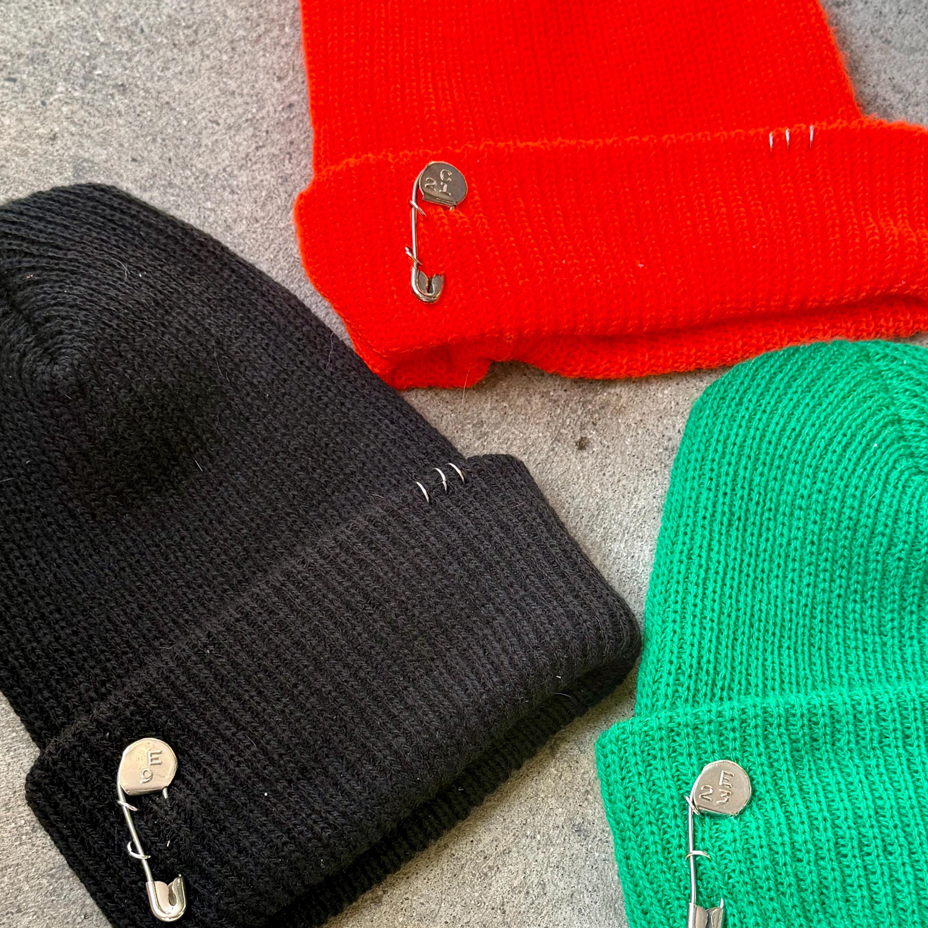 Polyester knit beanies featuring a 1940’s-50’s safety pin with a random number, 3 “piercings” and a “Hot Honey” tag on back. Available in 4 colors.