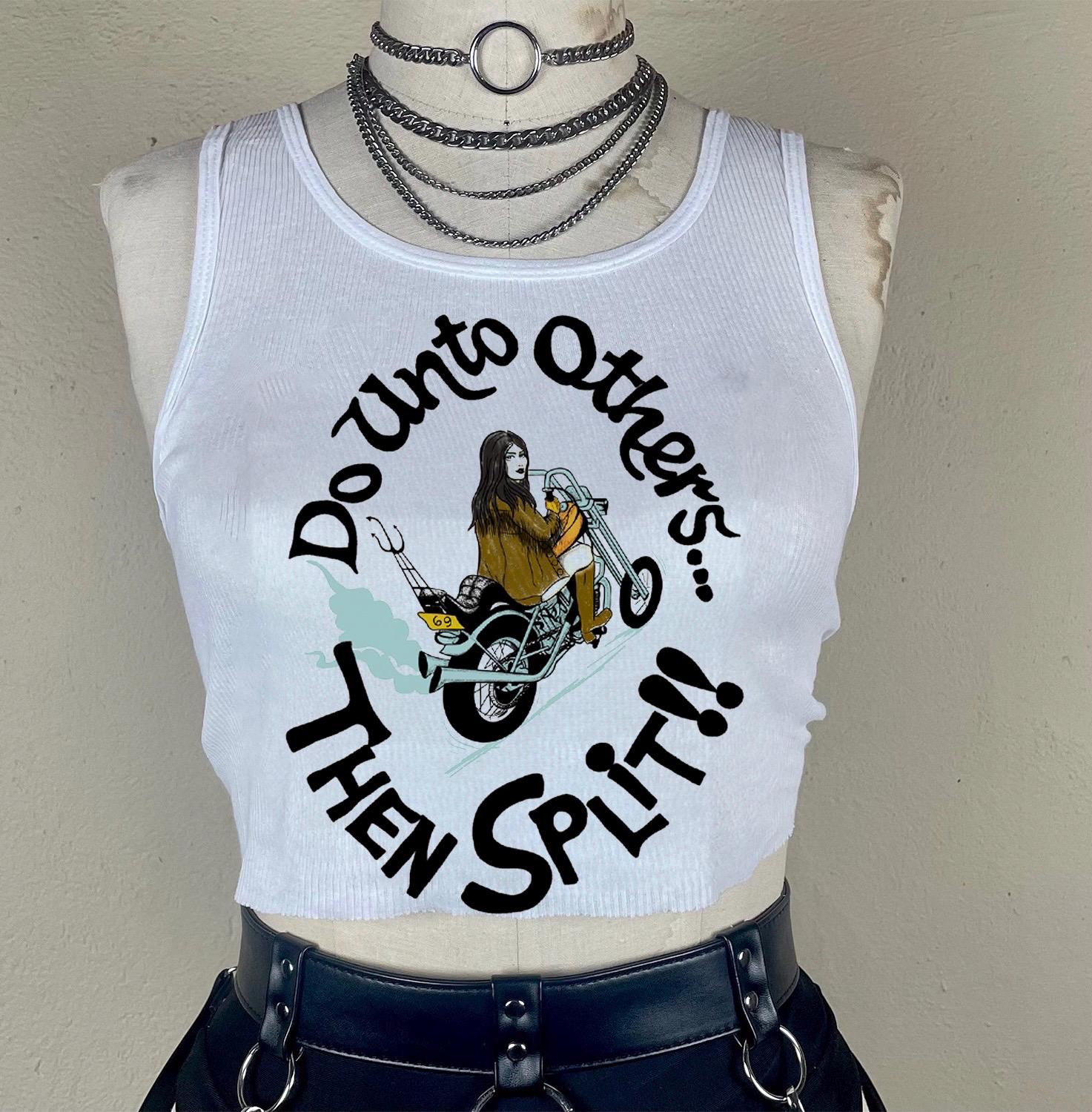 Ribbed tank with a handpressed graphic inspired by 70’s & 80’s bikers.