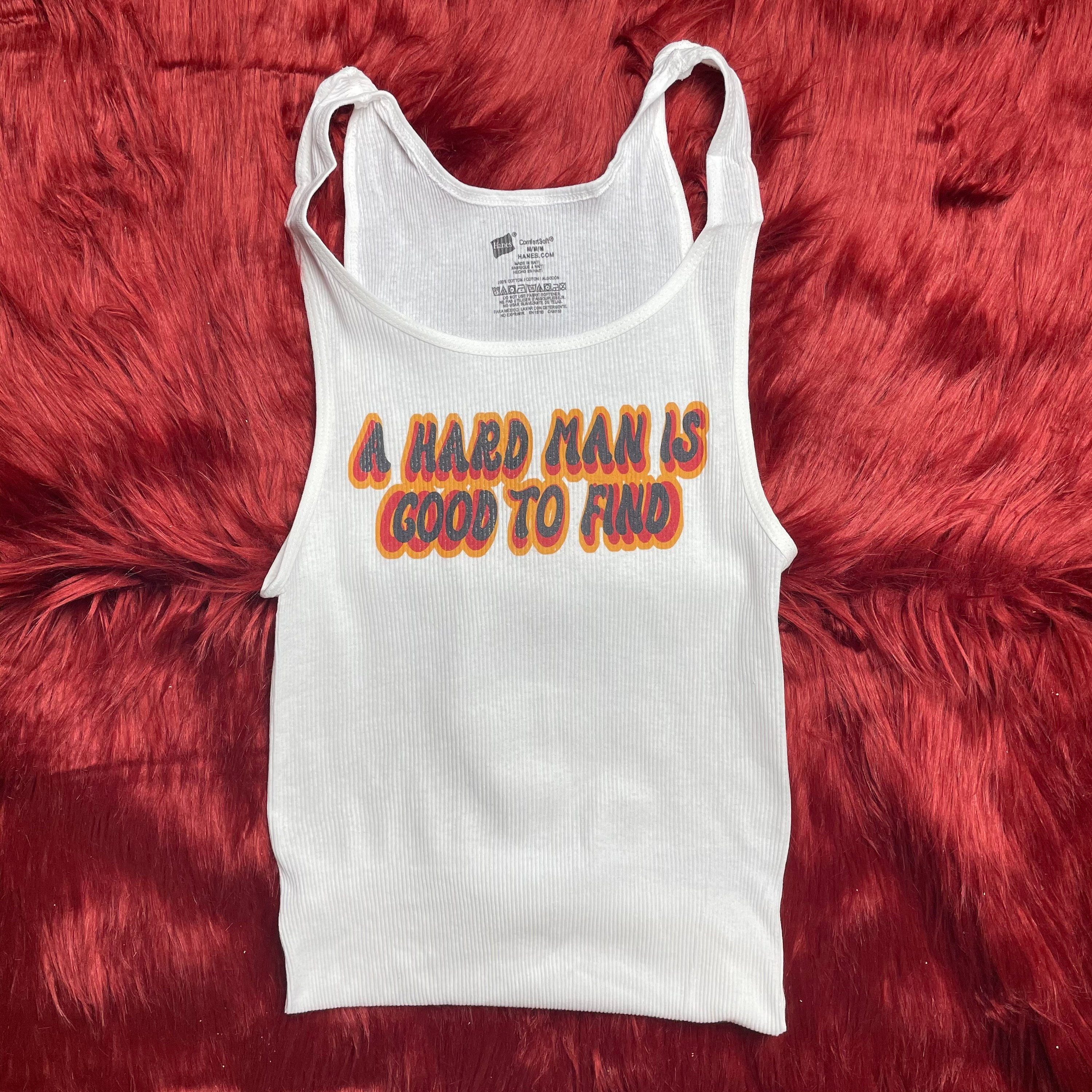 Ribbed tank with a A HARD MAN IS GOOD TO FIND handpressed graphic inspired by 70’s & 80’s bikers.